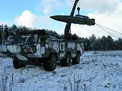 OTR-21 Tochka (Russian: оперативно-тактический ракетный комплекс (ОТР) «Точка», romanizedoperativno-takticheskiy raketnyy kompleks (OTR) "Tochka", lit.'Tactical Operational Missile Complex "Point"') is a Soviet tactical ballistic missile. Its GRAU designation is 9K79. Its NATO reporting name is the SS-21 Scarab. One missile is transported per 9P129 vehicle and raised prior to launch. It uses an inertial guidance system.[3][4]
