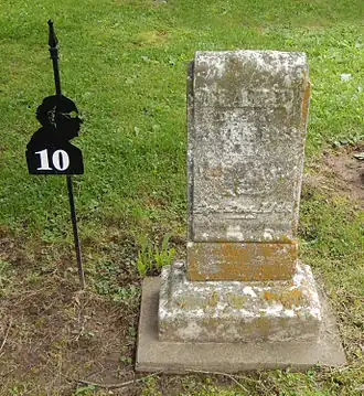A walking tour brochure is available from the City of Lewistown that lists the characters in the verse and their counterparts in the cemetery.[7] This brochure also includes a map of the cemetery layout and the location of the gravesites of individuals linked to the Anthology. The gravesites of these individuals are indicated by numbered markers that are located beside the corresponding gravestones and are shaped in the silhouette of Edgar Lee Masters. There are 40 such markers, representing 52 characters from the Anthology (some of the individuals interred in the cemetery correspond to more than one character in the Anthology). However, there is still some uncertainty as to the exact relationship between the individuals interred in the cemetery and the characters in the Spoon River Anthology. According to Masters, 66 of the anthology characters correspond to persons buried in the cemetery.[3]