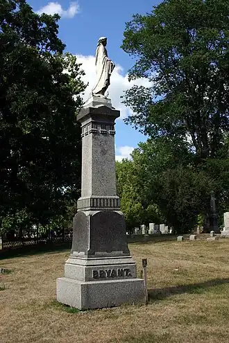 Perhaps the tallest monument in the cemetery is the memorial for William Cullen Bryant. This was not the poet William Cullen Bryant, but a distant relative who was the inspiration for the character "Percy Bysshe Shelley" in the Spoon River Anthology.[6] The memorial consists of a marble shaft that is topped by a statue of a woman.
