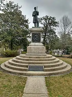 Along with regular grave sites for Confederate soldiers, a great burial mound was erected by the United Daughters of the Confederacy for the dead Confederate soldiers from the Second Battle of Fort Fisher. Dedicated in 1872, a bronze statue of a regular soldier stands atop a large circular stone base. The dedication plaque reads,