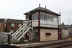 The station building, the nearby level crossing signal box and footbridge are all listed buildings. The signal box was the prototype for the Airfix kit signal box.[9] The station footbridge was refurbished between October 2020 and April 2021.[10]