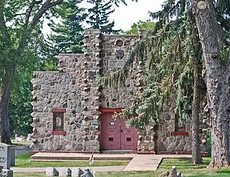 The Oakwood Cemetery Mausoleum is single story mausoleum constructed of pink, grey, and black fieldstone with grey mortar. The building measures 30 feet by 45 feet. The main facades are terraced, and it has a red tiled monitor roof containing small rectangular windows. The main facade contains small stained glass windows and metal doors, with the inscription "In Hope" carved in a sandstone block above. A heart-shaped stone tops the inscription, and three decorative metal plates are set in the stone. The facade edges and entrance are emphasized with projecting stonework.[2] The opposite facade also includes stained glass windows and metal decorations. The interior floor is marble, and the mausoleum contains space for 88 to 100 burials.[3]