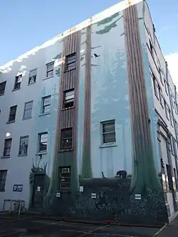 The south side of the building has a Trompe-l'œil of "The Honeymooners" – depicting two characters from the television show The Honeymooners – and a Pacific Northwest temperate rainforest mural painted by Robert Scott Dobie, a Vancouver Island-born artist.[3] The mural is 40' wide x 65' tall and is painted with acrylic resin on stucco.