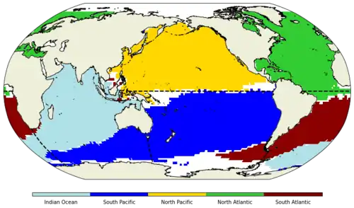 This figure shows the main ocean basins as they are defined in "Limits of Oceans and Seas". The boundaries are based on geography of continents and the equator.