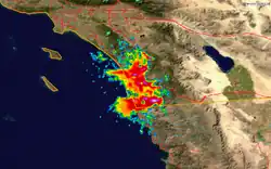 The October 2007 California wildfires, also known as the Fall 2007 California firestorm,[11] were a series of about thirty wildfires (17 of which became major wildfires)[8] that began igniting across Southern California on October 20. At least 1,500 homes were destroyed[12] and approximately 972,147 acres (about 3,934 km2, or 1,520 mi2) of land was burned from Santa Barbara County to the U.S.–Mexico border, surpassing the October 2003 California wildfires in scope, which were estimated to have burned 800,000 acres (3,200 km2).[3] The wildfires killed a total of 14 people, with nine of them dying directly from the fires;[13] 160 others were injured, including at least 124 firefighters.[3][14] At their height, the raging fires were visible from space.[15] These fires included the vast majority of the largest and deadliest wildfires of the 2007 California wildfire season. The only wildfire in 2007 that surpassed any of the individual October 2007 fires in size was the Zaca Fire.[16]