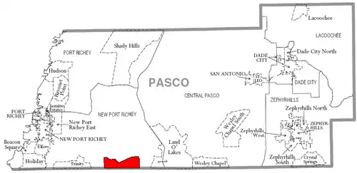 ![]() Location in Pasco County and Hillsborough county, Florida and the state of Florida | |
