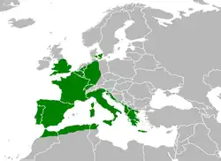 Western and southern Europe, from the Iberian Peninsula to Greece; it is common in Mediterranean countries and occurs in Central Europe from the western part of Germany through to Great Britain; in Denmark it is rare and sporadic. It is also recorded from the Maghreb. It is absent from alpine countries and Eastern Europe.
