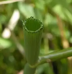 Tubular water-dropwort is a hairless, stoloniferous perennial growing up to 80 cm tall with brittle, hollow, inflated cylindrical stems 0.5 cm in diameter, which are constricted at the nodes (hence the specific name fistulosa). Unlike some other water-dropworts, it has no swollen tubers among the roots, but it can reproduce vegetatively by the lengthy stolons.[1]