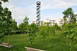 An observation tower offers a vertical path through the tree cover across the tops of the buildings. It evokes memories of the high chimneys in the former industrial area and represents the old desire for views and distance.[3]