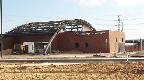 The Ofakim railway station is a railway station situated in Ofakim, Israel. It is located on the Ashkelon–Beersheba railway between Netivot and Beersheba and was opened to the public on December 31, 2015.[2] Next to the station, a new neighbourhood with affordable prices, specially designed for young people, is planned to be built by a NGO called Noah Initiative. The neighbourhood is designed as a Transit-oriented district, so the train will play a pivotal role in allowing the residents to live in the district while working in Beersheba or in the center of Israel.[3]