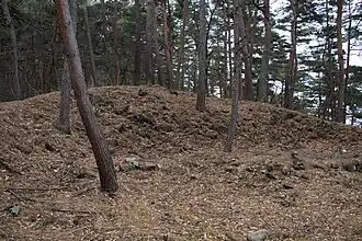 Hayashi Castle (林城, Hayashi-jō) was constructed by Ogasawara Kiyomune in 1459 to replace the smaller Igawa Castle. It is located on a ridge extending northwest from the Takato mountains, in the southeast portion of the modern city of Matsumoto. The castle is actually a double fortification sandwiched in a small valley between two ridges. The northern ridge contained the larger fortification, named the "Hayashi Large Castle" which was the residences of the Ogawasawara lords.[2][3][4] The southern ridge was approximately 500 meters away, and contained the smaller fortification, named the "Hayashi Small Castle", which was the main defensive center.[5][6][7]