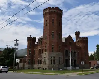 Ogdensburg Armory is a historic National Guard armory building located at Ogdensburg in St. Lawrence County, New York. It was built in 1898 and designed by State architect Isaac G. Perry. It consists of a 2-story, hip-roofed administration building and a large gable-roofed drill shed. It is built of load-bearing, reddish-brown Potsdam sandstone walls built upon a raised, rusticated, light-gray limestone foundation. The main block features 5-, 4-, and 3+1⁄2-story towers.[2]