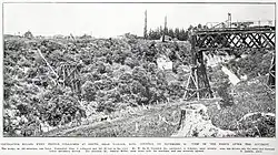 From 1908 until its closure in 1926,[14] Egmont Box Co's mill cut roughly 42,000,000 board feet (99,000 m3) of kahikatea, mainly for butter boxes,[15] in addition to some rimu.[8] Its tramway was extended as the bush was cut,[8] until it was cut out in 1921 and the mill closed.[15] The centre span of the 120 ft (37 m) Howe Truss bridge,[16] 160 ft (49 m) above the river, built of timbers up to 16 in (410 mm) thick,[17] which had been built by Sykes the & Shaw in 1911,[18] developed a crack which made it dangerous[15] to run their Climax locomotive[11] over it, so trucks were pulled over with a winch.[15] When the bush was cut out the bridge was sold for scrap. During demolition in 1923 it collapsed, killing one man and injuring another.[17]