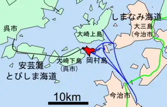 The island can be accessed by ferry from Imabari or from Ōmishima Island, Ehime. It can also be accessed by road from the city of Kure, Hiroshima Prefecture through the Akinada Islands Connecting Bridges.[1] The last of these bridges, the Okamura Great Bridge, is a 228 metre long arch bridge which connects Okamura Island with Nakano Island.[2]