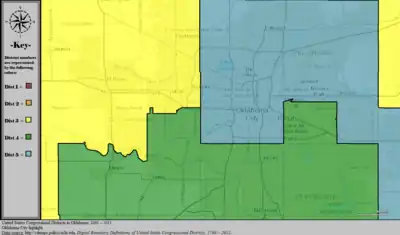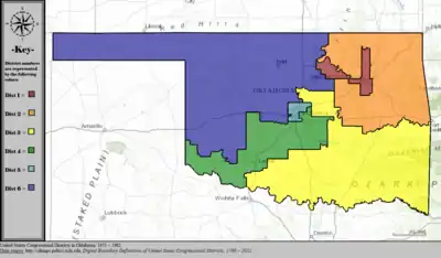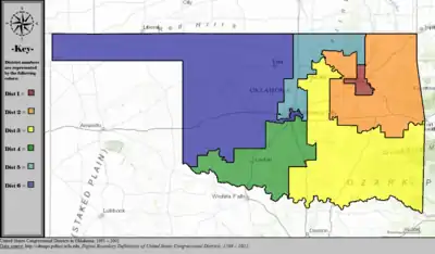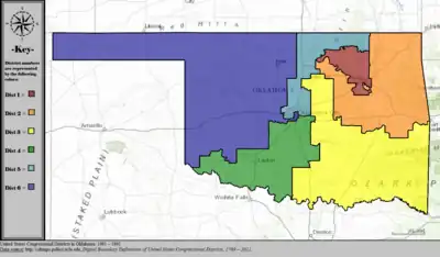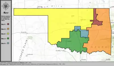Table of United States congressional district boundary maps in the State of Oklahoma, presented chronologically.[3] All redistricting events that took place in Oklahoma between 1973 and 2013 are shown.