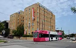 The Oklahoma City Streetcar (OKC Streetcar), also known as the MAPS 3 streetcar, is a streetcar system in Oklahoma City, Oklahoma, United States, that opened in 2018 and is operated by Embark. The 4.8-mile (7.7 km) system serves the greater downtown Oklahoma City area using modern, low-floor streetcars,[4] the first of which was delivered in February 2018.[5] The initial system has two lines that connect Oklahoma City's Central Business District with the entertainment district, Bricktown, and the Midtown District.[6] Expansion to other districts surrounding downtown as well as more routes in the CBD is planned.