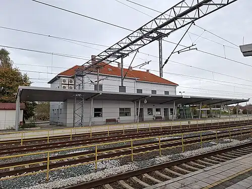 Okučani railway station (Croatian: Željeznička stanica Okučani) is a railway station on Novska–Tovarnik railway in Croatia. Located in Okučani. Railroad continued to Novska in one and the other direction to Nova Gradiška. Okučani railway station consists of 6 railway track. [1]