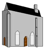 The original 1380 building was a simple parallelogram measuring externally 36 feet by 46 feet, containing a single large room, a great hall, extending up to the roof, lit by four 12 foot pointed-arched gothic windows, two on each of the long sides. The original entry door survives in the middle of the northern façade, but the two 12 foot flanking windows were later filled in, although their outlines are still visible in the stonework. The fireplace was at the western end and the dais on which was situated the lord's table was at the opposite eastern end, beyond which was the screens-passage leading to the domestic outbuildings.