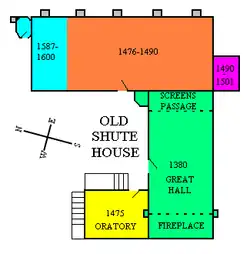 Old Shute House (known as Shute Barton between about 1789 and the 20th century), located at Shute, near Colyton, Axminster, Devon, is the remnant of a mediaeval manor house with Tudor additions, under the ownership of the National Trust. It was given a Grade I listing on 14 December 1955.[1] It is one of the most important non-fortified manor houses of the Middle Ages still in existence. It was built about 1380 as a hall house and was greatly expanded in the late 16th century and partly demolished in 1785. The original 14th-century house survives, although much altered.