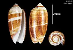 Shell of Oliva bifasciata (specimen at MNHN, Paris) | |