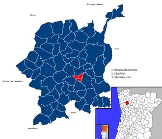 Oliveira, São Paio e São Sebastião (officially: União das Freguesias de Oliveira, São Paio e São Sebastião) is a civil parish in the municipality of Guimarães, Portugal. It was formed in 2013 by the merger of the former parishes Oliveira do Castelo, São Paio, and São Sebastião. The population in 2021 was 7,832,[1] in an area of 1.55 km2. The civil parish makes up the city centre of Guimarães.
