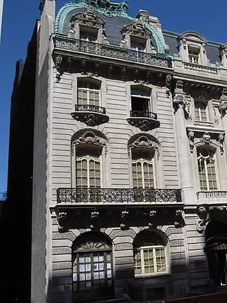 On the second floor, the facade is also rusticated but is made entirely of smooth limestone.[9] The second-story French doors open onto a balcony with an elaborate iron balustrade.[10] At the top of the second-story windows are scallop designs, which are recessed into the facade. There are corbels with cartouches below either of the third-story window sills. The windows on the third story are placed within segmentally-arched openings, and there are ornate iron window guards in front of the windows.[9] Above the third-story windows is a cornice with brackets, as well as an iron railing above the cornice, which extends across the house. The fourth story is within a convex mansard roof,[9][10] which is made of copper and slate.[4] There are two dormer windows on the roof, each with an elaborate copper cresting and an ornate frame.[9] Above each dormer window is a segmentally-arched pediment with carved cartouches, and there are also volutes flanking each of the dormer windows.[10]
