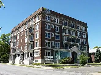 Olivia Apartments is a historic apartment building located at Joplin, Jasper County, Missouri. It was built in 1906 by a Canadian engineer who moved to Joplin during the mining boom and finished in October of 1906.[2] It is a five-story, U-shaped, red brick building. It measures approximately 100 feet by 125 feet and features Bedford limestone ornamentation and light colored brick cross hatching.[3]: 5