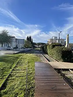 Olympia railway station (Greek: Σιδηροδρομικός Σταθμός Ολυμπίας, romanized: Sidirodromikós stathmós Olympia) is a railway station that serves the town of Olympia, Elis in Western Greece, Greece. Located in the centre of Olympia, the station was opened in 1891 by the Pyrgos-Katakolo Railway Company (SPK), (now part of OSE). Today TrainOSE operates 3 daily scheduled Regional trains[3] to Katakolo, via Pyrgos.[4][5] The station is unstaffed[6] however there are waiting rooms available. Olympia station is close to Ancient Olympia.