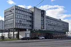 The residential part of the microdistrict was built in standard panel residential buildings of the P-3 series[22] using active colors in the design of the facades.[24] In the microdistrict, their distinctive feature was the presence of a "back" entrance, marble decoration of the entrance halls and balconies lined with special panels. The directorate building consists of two perpendicular architectural forms - a four-story, made of aluminum panels and rising on supports covered in black labradorite, with a blue clock on the northern façade, and a one-story, made of limestone[25] and with glass walls, where the post office is located. The cultural center is equipped with three halls and a restaurant.[26] The main building of the microdistrict's sports complex, where the athletes trained, consists of three floors with service rooms. Nearby there is a wing with a swimming pool and gyms.[11][9]