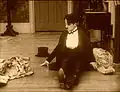 He retrieves himself, and walks surprisingly steadily for a few steps, until another mat approaches him, and his legs slide out from below him, causing him to fall on his back. He lands between a tiger rug and a stuffed Eurasian lynx, which terrify him as he thinks they are real. He tries edging away from each other, only resulting in more hilarity as Charlie tries kicking the tiger rug away and then later thinks his foot is being eaten by the tiger. However, it doesn't end there. He tries to lure the lynx by giving it an air-kiss, and then walks up to it and kicks it away. That, however, ends when he proceeds onto the table.