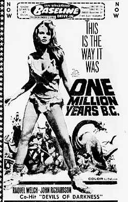 One Million Years B.C. is a 1966 British adventure fantasy film directed by Don Chaffey. The film was produced by Hammer Film Productions and Seven Arts, and is a remake of the 1940 American fantasy film One Million B.C.. The film stars Raquel Welch and John Richardson, set in a fictional age of cavemen and dinosaurs existing together. Location scenes were filmed on the Canary Islands in the middle of winter, in late 1965. The UK release prints of this film were printed in dye transfer Technicolor. The U.S. version released by 20th Century Fox was cut by nine minutes,[3] printed in DeLuxe Color, and released in 1967.[4]