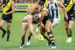 A knock-on is using the hand, either clenched or open, to tap the ball to the advantage of a team-mate, without ever taking possession of the football (except out of the ruck). It has the same advantage as a quick handpass or kick, but is not recognised as a disposal because the player never has possession.
