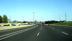 In the interim period, work went into expanding the six lane freeway through Toronto and Markham. A combination interchange was built with the new Highway 407 ETR which opened in June 1997, which as a prerequisite required the realignment of some ramps from the nearby Highway 7 interchange.[29] In early 1998, the MTO announced plans for two contracts to widen Highway 404 south of Highway 7. The first contract converted the grass median into an additional lane in each direction with a central concrete barrier between them, with the inner lanes to eventually be converted into HOV lanes. High-mast lighting was installed in the median barrier, replacing the unique luminaires that were mounted outside of the right shoulder of each carriageway. With the shift in road illumination completed as a prerequisite, the second contract would result in an additional lane in each direction on the outside the existing freeway south of Highway 407, making it ten lanes wide, with expansion of the southbound and northbound lanes completed in 2005 and 2007, respectively.[30][31][32]
