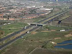 In 1987, construction began south of the future Highway 407 interchange, expanding the two lane Heart Lake Road to a six lane freeway. In addition, work began on the future southbound lanes north of Steeles Avenue.[21][22] In 1990, the Courtney Park Drive overpass was widened from two to four lanes as ramps were added to connect to the freeway south of it. By mid-1991, Highway 410 was complete from north of Highway 401 to Bovaird Drive, and work was underway to complete the junction, with an eleven-span semi-directional flyover ramp from Highway 401 eastbound to Highway 410 northbound, while the flyover ramp from Highway 410 southbound to Highway 401 eastbound replaced the existing loop ramp.[23] The interchange with Highway 401 was expanded alongside the widening of that highway to a collector-express system and opened to traffic ramp-by-ramp beginning August 28, 1990 and continuing through the end of the year.[24]