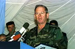 Throughout the course of its operation, Deny Flight was directed by Allied Forces Southern Europe (AFSOUTH) in Naples, under the command of the Commander-in-Chief of Allied Forces Southern Europe.[15] At the beginning of the operation, Admiral Jeremy Boorda served as the commanding officer; he was replaced by Admiral Leighton W. Smith in 1994.[21] Smith and Boorda, however, delegated day to day authority to Allied Air Forces Southern Europe (AIRSOUTH) commanded by Lieutenant General Joseph W. Ashy (until 1994) and then Lieutenant General Michael E. Ryan.[73] While AIRSOUTH maintained day to day command, "mission tasking and operational control" were delegated to the commander of the NATO 5th Allied Tactical Air Force (5ATAF), initially Lt Gen Antonio Rosetti[74] and later Lt Gen Andrea Fornaserio, both of the Italian Air Force.[73]