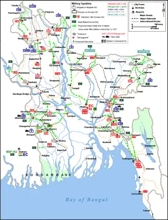 The third operation was designed by Lt. Gen. Sagat Singh, commander of the Indian Army IV Corps, attached to the Eastern Command, and the Bangladesh forces operating in his operational area. These forces fought against the Pakistani forces in Sylhet, Comilla, and Chittagong as part of the overall campaign from 21 November to 16 December 1971.[6]