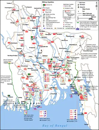 Mukti Bahini naval commandos launched several sabotage efforts in the cities of Chittagong, Chandpur, Mongla, and the Narayanganj District against the combined operating forces of the Pakistan Army, Pakistan Marines, Pakistan Navy SEAL Teams, and the East Pakistan Security Forces on the night of 15 August 1971.[2][4] Bengali submariners who had defected from Pakistani submarine PNS Mangro (S133), then based in Toulon, France, led the attacks, and this is also known as part of Operation Jackpot.[5]
