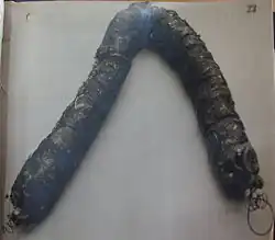 Socks were long thin canvas bags of incendiary material each weighing about 6 lb (2.7 kg). Socks were packed with wood wool, bound with wire and soaked in boiling paraffin wax.[2][17] Each Outward balloon could carry three socks. The bundle measured about 27 in × 10 in × 10 in (690 mm × 250 mm × 250 mm).[19] When dropped, socks formed a V‑shaped sausage designed to catch in the crown of a tree.[2] Fuses were inserted in each end of the device and it would burn from each end for 15 minutes.[2] In 1941 the Royal Navy had a stock of 10,000 such socks already fused and ready to be used and another 20,000 bodies that could be brought forward as required.[2][d]