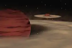 The discovery of the pair was announced in a 2006 Science article by Ray Jayawardhana and Valentin D. Ivanov .[3] The objects were discovered using telescopes of the European Southern Observatory's New Technology Telescope in La Silla, Chile. The masses were originally reported to be lower, at 14 and 7 Jupiter masses, which would have made the smaller object a planetary-mass object, or planemo. The system was announced as the first reported binary system of objects this small. However, later observations and calculations have revised the masses upward. Close et al.[4] estimate the mass of the primary, designated Oph1622A as 12–21 times that of Jupiter and 9–20 Jupiter masses for the less massive Oph1622B, while Luhman et al.[5] assign values of 57 and 20 Jupiter masses. Despite the acronym "Oph" appearing in its name (implying that it may belong to the young Ophiuchus molecular cloud), Oph1622 is likely to be older than its originally adopted age of 1 million years. More likely, it is a member of the Upper Scorpius subgroup of the Scorpius–Centaurus association, which has an age of 11 million years.[6] For an adopted age of 11 million years, the system has inferred masses of 53 and 21 Jupiter masses,[6] similar to that derived by Luhman et al.[5]
