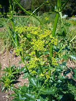 The genus name Opopanax derives from Anglo-Norman opopanac, from Latin opopanax, from Hellenistic Greek ὀποπάναξ, from Ancient Greek ὀπός (opos, "juice") + πάναξ (panax, "all-healing").[2] Therefore, opopanax literally means the juice (gum resin) of all-heal. There were many different plants called all-heal (πάνακες or panaces) in Ancient Greece and Rome. However, according to Dioscorides, opopanax was obtained specifically from a kind of all-heal named πάνακες Ἡράκλειον (panaces Heraclion, "Hercules' all-heal"), which has been identified as Opopanax chironium,[3][4][5] O. persicus[5] and O. hispidus.[6]
