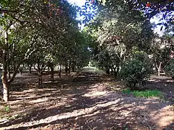 A 24-acre (10 ha) portion of the original estate, including the residence, gardens, oaks and citrus orchard, was designated as a Historic-Cultural Monument in January 1965. Those 24 acres (10 ha) were purchased by the City of Los Angeles in 1966 for $400,000.[5] The city-owned property includes a Spanish-style adobe residence, extensive gardens, oak trees hundreds of years old, Dayton Creek, nature trails, fruit orchards, rose gardens, community garden plots, picnic tables and a multitude of exotic trees, plants and shrubs.[5] Some of the more unusual trees found at the ranch are Purple Lily Magnolias, Lady Palms (Raphis excelsus) native to Asia, Bunya Bunyas (Araucaria bidwillii) evergreen native to Australia with cones weighing up to 15 pounds (7 kg)), Cork Oaks (Quercus suber), and one of the many Coast Live Oaks (Quercus agrifolia) measuring 32 feet (10 m) in circumference, believed to be 700 years old.[2][3][6][7] For 53 years (1927–1980), Ernest Cornejo was employed as the property's caretaker and gardener. Cornejo was hired at age 17 to plant and tend to the exotic trees and plants.[8]