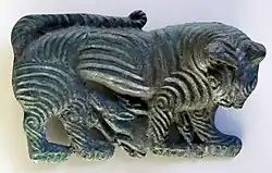 Belt buckle with paired felines attacking ibexes, derived from earlier Scythian art. Ordos, 3rd century BC. Usually described as Xiongnu despite early date.[59][60][61]