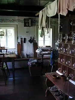 In a room that had been furnished in the manner of an old Ore Mountain parlour were displayed a painted four-poster bed (1764), a huge chest (1734), a chest with a lid painted on the inside (1785), a colourful wardrobe covered with flowers (1798), a giant farmer's table with a tabletop of valuable wood, stone items, guild tankards, glasses and other household items. On the table stood a might clay pitcher (1739), a tin lamp (Gockel-Lampe) and an open family bible. The whole was completed by a wood-shaving candlestick (Spanleuchter) with wooden shavings. After a tour visitors could buy a "miniature farmhouse room with a stove in a matchbox" at the counter.