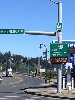 Oregon Route 34 is a state highway in the U.S. state of Oregon that runs between the city of Waldport on the Oregon Coast and the city of Lebanon in the western part of the state. OR 34 traverses the Alsea Highway No. 27 from Waldport to Flynn, part of the Corvallis–Newport Highway No. 33 from Flynn to east of Corvallis, and the Corvallis–Lebanon Highway No. 210 from east of Corvallis to Lebanon, of the Oregon state highway system.[2] In Corvallis, OR 34 includes a brief concurrency with U.S. Route 20 and OR 99W over the Pacific Highway West No. 1W.