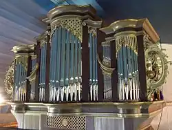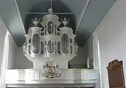 The organ in Uttum was built around 1660 by an unknown master and is a resounding testimony to the heyday of Dutch Renaissance organ building. It is assumed that the Cornelius and Michael Slegel brothers from Zwolle were the builders.[22] The structure of the case with the trapezoidal central tower and the two bass pipes standing next to each other in the middle is typical of the Groningen organ style of the 17th century. Pipe material was used either from the predecessor organ or from an organ from an abandoned monastery church. According to an old tradition, this is said to be the Sielmönken Monastery.[23] The pipework with its singing, vocal principals and other colorful stops imitating different instrument families is almost completely original, including the trumpet stop, which is considered one of the oldest in the world alongside the Westerhus organ.[24]