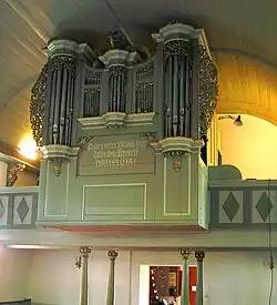 One of his twelve new organs was built by Johann Friedrich Constabel from Wittmund, who was also active in the neighboring Jeverland,[42] only one instrument has survived. Originally built for Bargebur in 1738, it stood in Hamswehrum from 1864-1967 before being transferred to its current location in Jennelt. Its organ in Greetsiel (1738) fell victim to a new building in 1914, so that only the original case remains. In 1760, Constabel began a new building in Funnix; however, it was completed in 1762 by Hinrich Just Müller, who continued Constabel's workshop.[43]