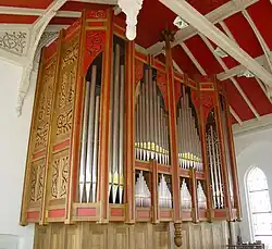 Joachim Richborn, the most important Hamburg organ builder from Schnitger's time,[39] whose field of work extended as far as Scandinavia, built organs in Berdum (1677) and Buttforde (1681). The Organ in Buttforde is almost completely intact and is one of the most valuable organs in the region. Due to the height required for the Principal 8′, a recess had to be made in the wooden ceiling above the organ, which was too low, so that the instrument could stand on the rood screen. This is a rare case in which even the original voicing with its vocal tone coloration has been largely preserved and has hardly any Core stitches. This unaltered original condition is almost unparalleled for the 17th century, particularly in the case of the Principal in the façade.[40]