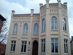 In the 16th and 17th centuries, East Frisia was influenced by Dutch and Hamburg organ culture. Emden was the center of East Frisian organ building in the 16th century. Petrus von Emden built an organ for Groothusen in 1520. Johannes Emedensis ("von Emden") is known to have built an organ for Uphusen in 1531, of which the later double doors (1571) and case fillings are still preserved. The ornate façade of his organ (1526) in Scheemda in the Netherlands with its chiseling pipes is now in the Rijksmuseum Amsterdam.[10] Religious refugees of the Reformed faith, who fled from the Netherlands during the Eighty Years' War and found refuge in Emden, also shaped organ building in East Frisia in the late 16th and early 17th centuries. The external structure is characterized by the central polygonal bass tower and two lateral pointed towers for the tenor pipes. The high (and correspondingly short) pipes in the treble are arranged between them in two flat fields, which are often two-storied. The Hamburg facade owes much to this Dutch influence. The original range of the keyboards on Renaissance instruments of FGA-g2a2 was extended over the centuries to the modern range from C upwards. The Renaissance style is also characterized by the type of veiling above the façade pipes, the crowning on the pipe towers and the continuous banners.[11] It should be emphasized that in many East Frisian organs of the 17th century, pipe material from the previous instruments of the 16th century was reused. With the advent of the Baroque era, the double doors gave way to side ears made of veilwork.
