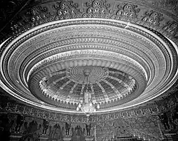The lobby and mezzanine were decorated with Hindu deities and "the main staircase leading to the balcony was flanked by a pair of huge dragons," while the auditorium was topped by a vast dome, lit indirectly by 2400 light bulbs, as well as a 2,000-pound (910 kg) "tree-sized Far Eastern style chandelier"[3] including 3000 light bulbs in seven colors, costing $7000.[2] The asbestos drop curtain was blue with gold fringes and tassels and included a hand-painted royal procession scene, with "towering snow-capped mountains in the background [and] a misty blue apparition of the seated Buddha."[2] The Historic American Buildings Survey noted the "remarkably early extensive use of neon lighting" in the sign and sheet-metal marquee.[2]