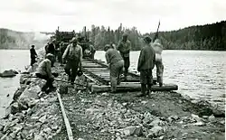 The section from Orivesi to Jämsä was ordered to be built in 1938.[2] The approval was influenced by Rudolf Walden, who promised that the Yhtyneet Paperitehtaat (now UPM-Kymmene) factories would contribute towards covering the costs.[3] Construction began in 1939 and continued during the war years, partly with labour from prisoners of war. The 56 kilometres (35 mi) long line to Jämsä was completed in 1950 and the extension to the Jämsänkoski mills, the costs of which were split half and half between the state and Yhtyneet Paperitehtaat, followed in 1951. The line from Jämsä to Olkkola on the shore of lake Päijänne was completed in 1953.[2] On average, 300 people worked on the line each year, peaking at over 700 at times. The line demanded the construction of numerous bridges, curves and embankments, thanks to the complicated terrain it passes through.[3] The railway and its branches were needed to transport raw wood from the Päijänne area, as well as products of the growing wood processing industry in the Jämsänjoki valley. Partly thanks to the railway, the Jämsänkoski paper mill later became accompanied by another in Kaipola, as well as a sawmill in Olkkola. The sidings also served passenger traffic. The volume of traffic, peaking in the mid-1960s, quickly collapsed by the end of the decade and passenger services were discontinued in 1969. By the 1970s, the line's traffic dwindled to a few freight trains a day.[2]